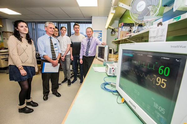 Geraint Williams, EBME Site Lead with Patrick Hill and sixth form learners Darci Tyler, Jack Huang, Simon Rogers and Rowan Boardman